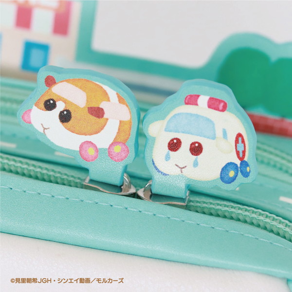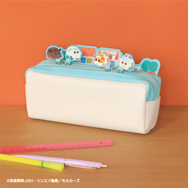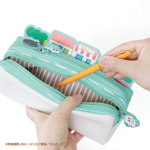 スライダー部分にはモルカーが付いており、ファスナーを開閉するたびにモルカーたちが動く。アニメの第一話「渋滞は誰のせい?」のワンシーンをイメージしたジオラマ風のペンケース。ポーチは、収納部分が2つに分かれているので、中身もたっぷり入る。スライダー部分にはモルカーたちがプリントされている。
