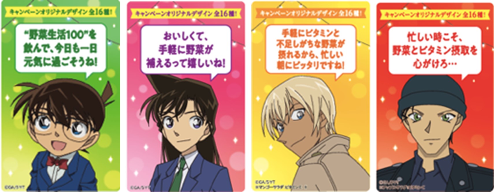 キャンペーン期間中は、「野菜生活100オリジナル ホームパック」4品において、『名探偵コナン』登場キャラクターがデザインされた、限定パッケージ (全16種)で販売いたします。
