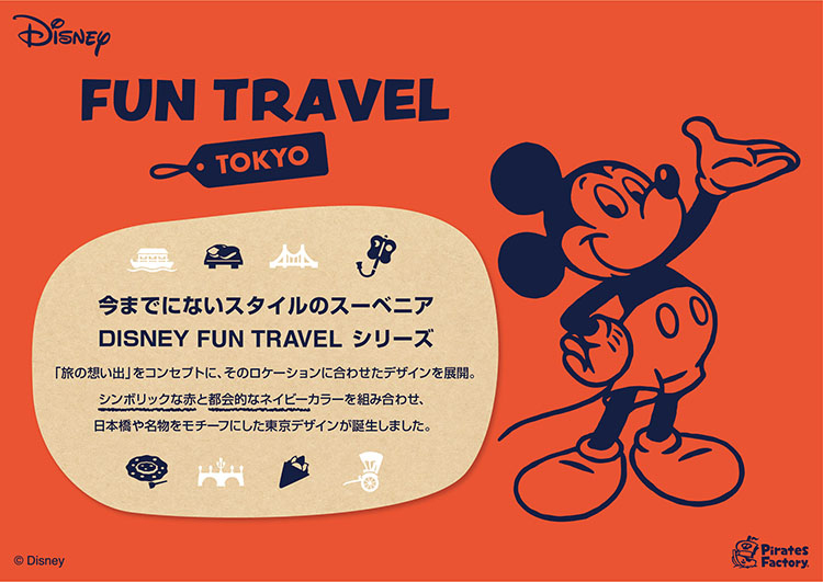 株式会社Pirates Factoryは、10月15日より雑貨専門店・東京駅キャラクターストリートワゴンPOP UPショップ・自社オンラインショップでの販売を皮切りに、今までにない新しいスタイルのスーベニアグッズ“DISNEY FUN TRAVELシリーズ”を発売いたします。
