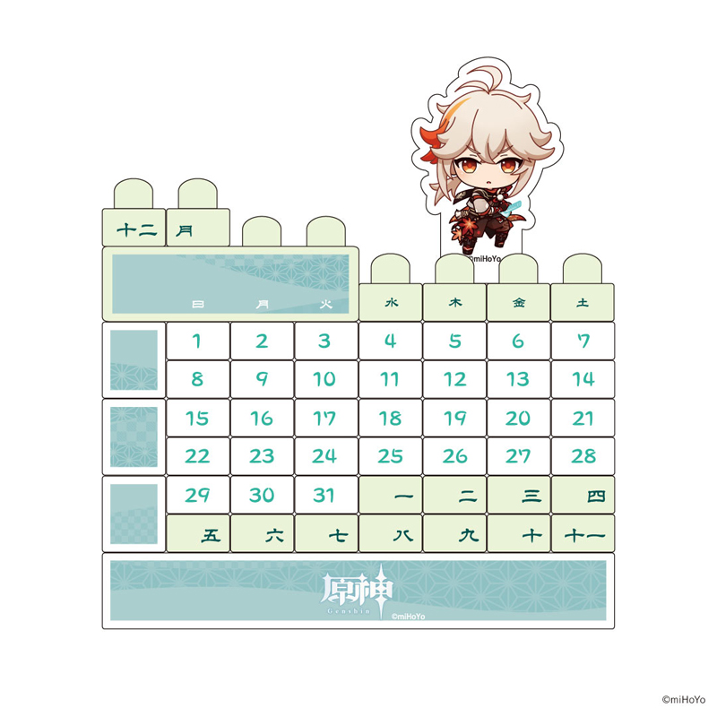 稲妻エリアの新キャラクター・楓原万葉の描き起こしミニキャラを使用したオリジナルブロックカレンダー。万葉をイメージしたカラーデザインです。ブロックの配置を変えて、万年楽しめます。