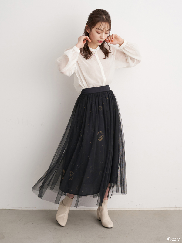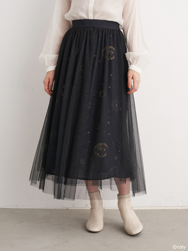 夜空をイメージしたプリントスカートにチュールを重ねた幻想的なスカート。プリントには賢者の魔法使いの紋章も落とし込み、特別なデザインに仕上げました。