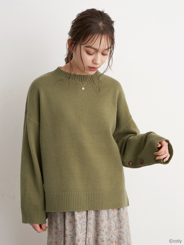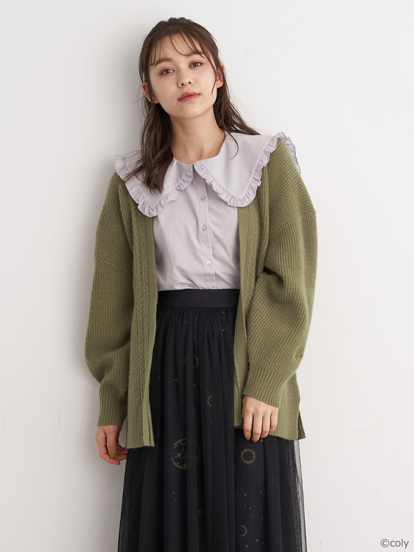 ボタンを少し開けてスリットにしたり、全て開けてポンチョのようなシルエットで着用するなど自由に着こなしを変えられるアイテムに仕上げました。着回しやすいくすみ系カラーの柔らかい糸を使用し、着心地も◎。