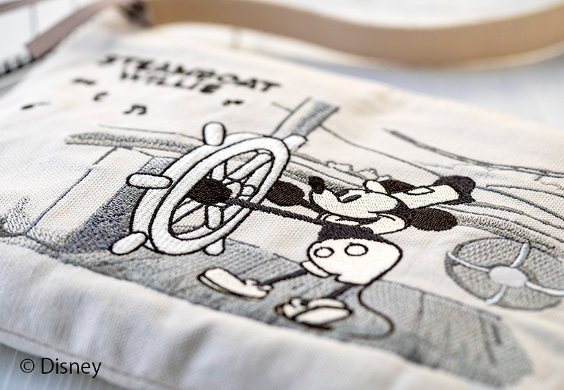 劇中でも印象的な、ミッキーマウスがご機嫌に船を操縦する様子を描いたデザインに仕上げました。スクリーンをそのまま切り取ったようなモノトーンカラーが、クールな可愛らしさに。