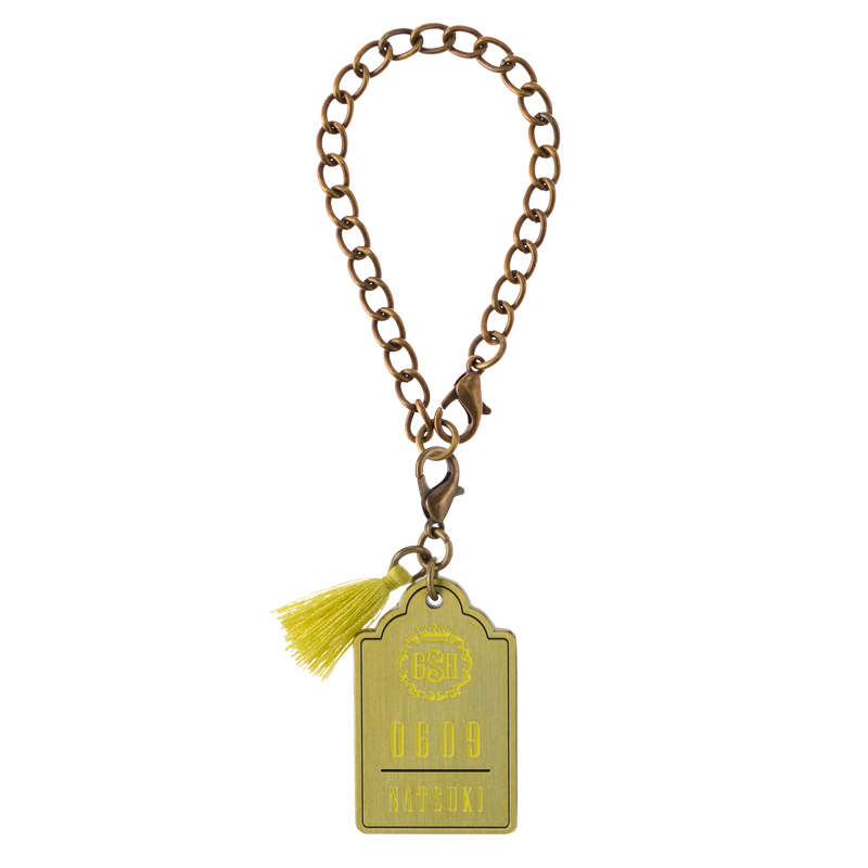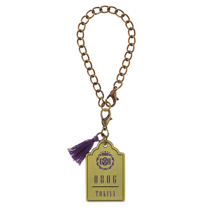 「Grand Shining Hotel」のルームキーに付属するプレートをイメージしたトレーディングチャームです。タッセル付きのプレートにはアイドルたちの名前や誕生日が刻印されています。