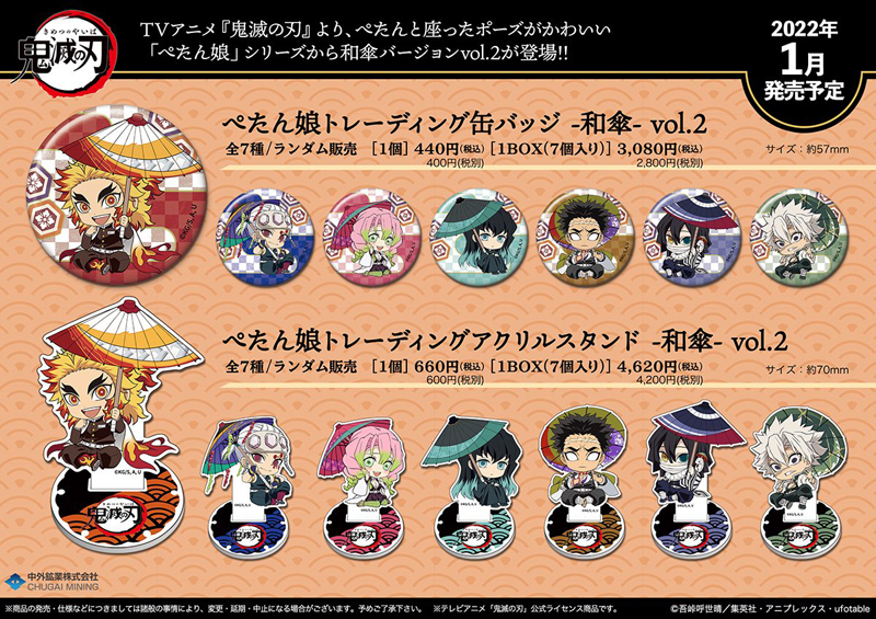 中外鉱業株式会社コンテンツ部は、TVアニメ『鬼滅の刃』より「トレーディングラバーストラップ -和傘- vol.2」、「ぺたん娘トレーディング缶バッジ -和傘- vol.2」、「ぺたん娘トレーディングアクリルスタンド -和傘- vol.2」の販売を発表いたします。2022年1月発売予定となります。