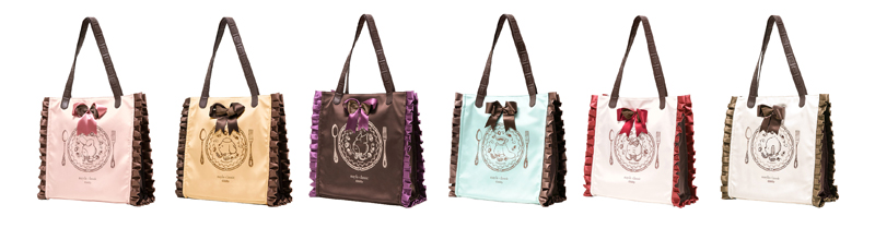 コラボアイテムは、チョコレートをイメージしたレザー素材のハンドルと、艶のある上質なサテン生地、キャラクターをイメージした華やかなリボン装飾、更にサイドにはフリルを施した、甘く大人っぽいデザインのトートバッグです。