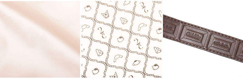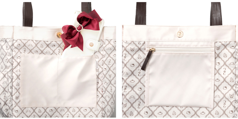バッグの表地には、エレガントな光沢感が特徴の上質なサテン生地を採用し、大人っぽさを演出。裏地には、サンリオコラボオリジナルのモノグラムをプリントし、キュートに仕上げました。