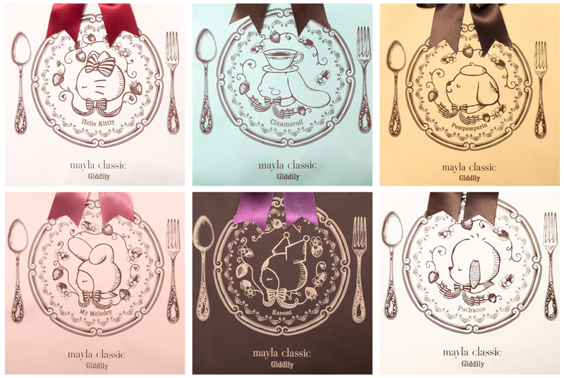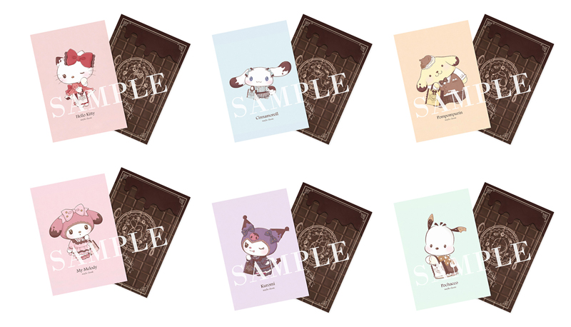 「マイメロディ」、「ポムポムプリン」、「クロミ」、「シナモロール」、「ハローキティ」、「ポチャッコ」の6キャラクター展開で、キャラクターのイメージカラーと、チョコレートブラウンを組み合わせた配色です。チョコレート感満載な色使いと、大人っぽくおめかししたキャラクターたちをどうぞお楽しみください。