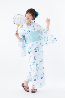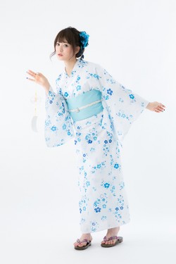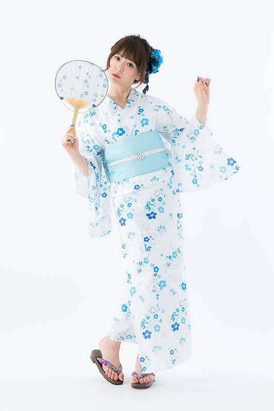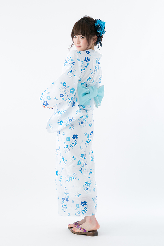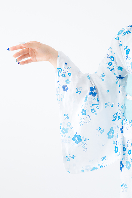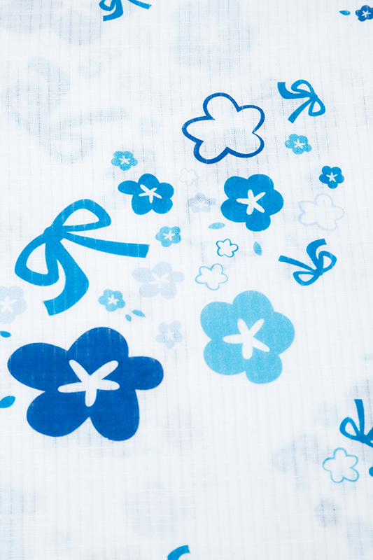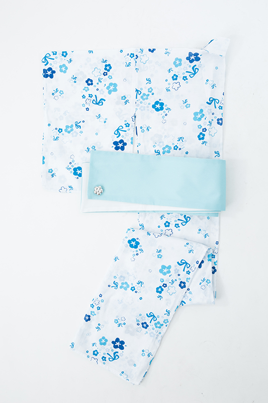 真っ白な生地にブルーで彩られた花柄浴衣は、目に涼やかな印象を与えてくれる。小花柄と一緒にちりばめられたブルーのリボンは、めんまのワンピースを思い起こさせるデザインだ。