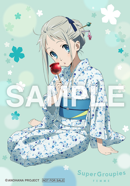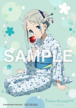 今回、購入者特典としてSuperGroupiesで予約した方には特製ブロマイドを、またBEAMS JAPANで予約した方にはクリアファイルをプレゼント! りんご飴を片手に、商品と同じ浴衣を身に着けるめんまがとってもキュート♪