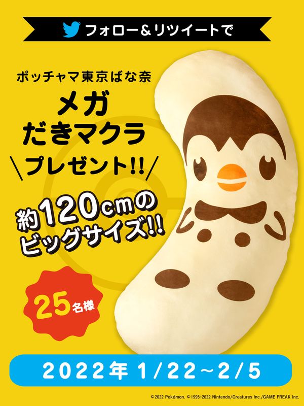株式会社グレープストーンが展開する“東京ばな奈ワールド”は、新スイーツシリーズ“ポケモン東京ばな奈”の第3弾商品『ポッチャマ東京ばな奈』の大好評を記念し、2022年1月22日~2月5日23:59の期間“ポッチャマ東京ばな奈メガだきマクラ”のプレゼントキャンペーンを開催しています。