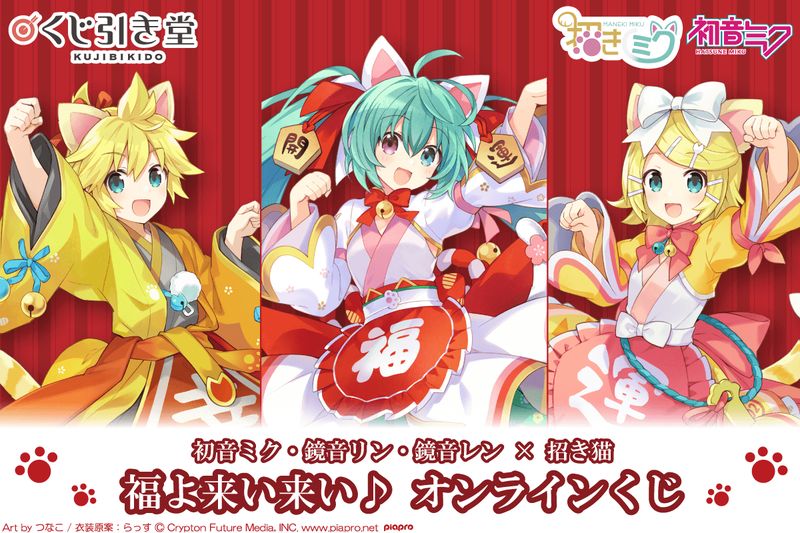 株式会社KADOKAWAは、運営するオンラインくじサービス“くじ引き堂”において、『初音ミク・鏡音リン・鏡音レン×招き猫 福よ来い来い♪オンラインくじ』を、2022年2月22日17:00より販売します。