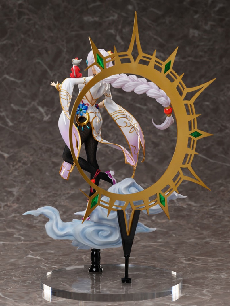 衣装はエミリアをイメージした光沢感のある純白のドレスに、赤や金の装飾が高級感を、腕には春節衣装に身をまとった精霊・パックが世界観を引き立てます。また、ドレスのスリットからのぞく黒タイツは布製で、本物の質感を再現。浮雲をデザインした台座には、エミリアが凛として立ち、女性らしい気品と優雅さを備えた美しさがあらわれるよう演出しました。凛とかまえ穏やかに微笑みをうかべた気品溢れるエミリアがご堪能いただけます。