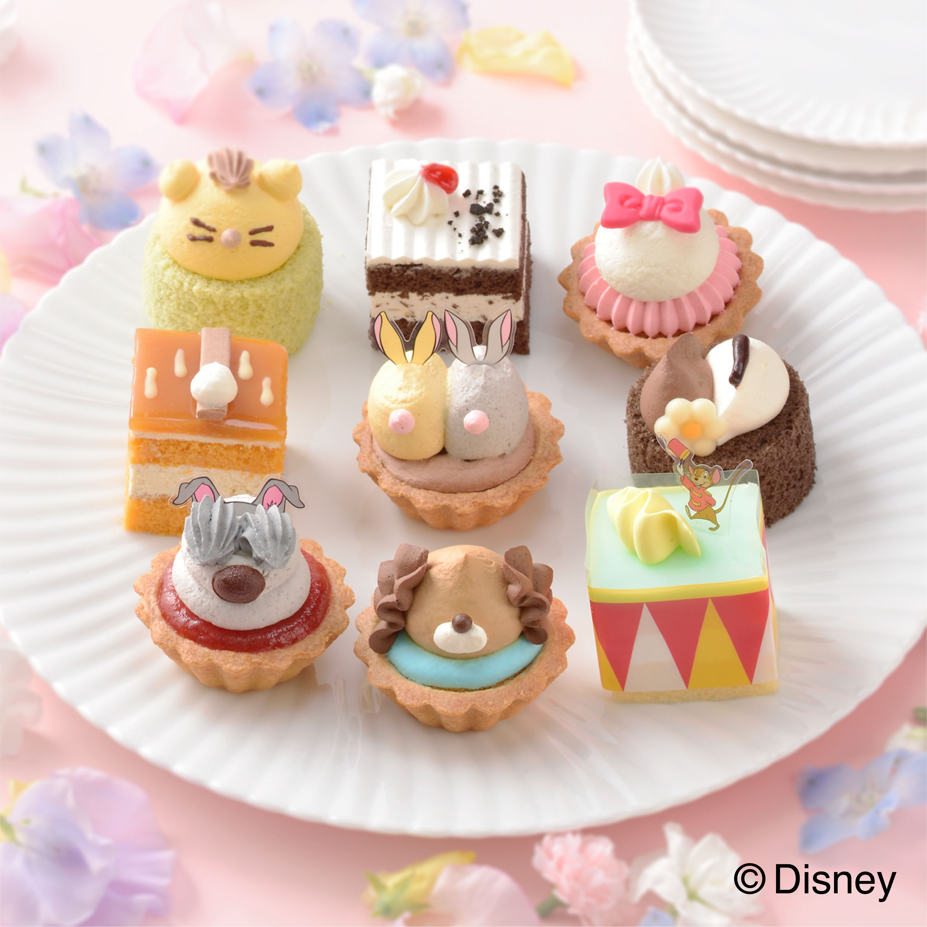 映画公開80周年(1942年公開長編アニメーション映画)を迎えた『バンビ』のキャラクターを中心に、『わんわん物語』、『ダンボ』、『おしゃれキャット』、『101匹わんちゃん』、『ライオン・キング』6つの物語の人気キャラクター11種を、プチケーキにデザインしました。