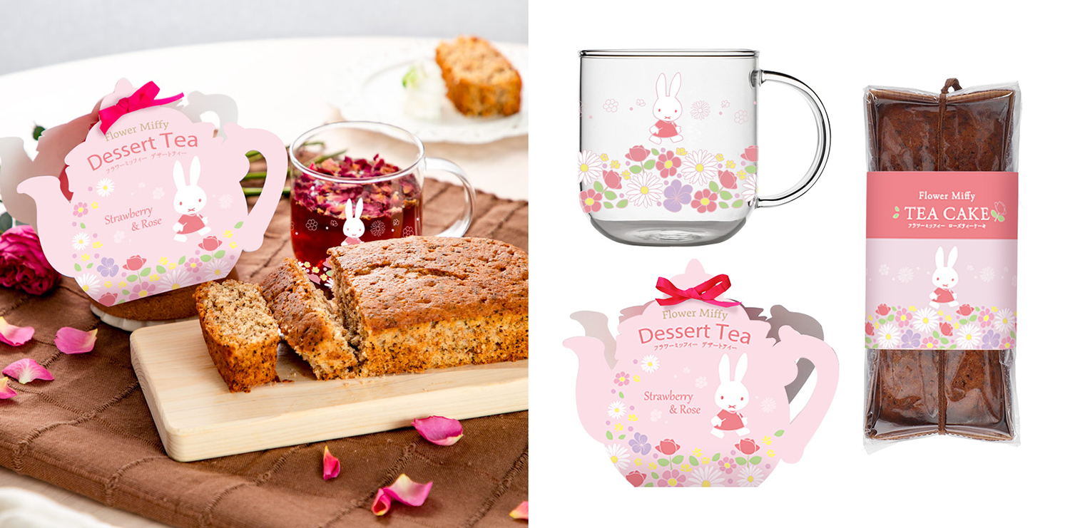 また、お花とは一味違う贈り物をしたい方には“フラワーミッフィー ティータイムセット”がおすすめです。ドライフルーツと食べられるお花”エディブルフラワー”のバラを浮かべて楽しむ贅沢なデザートティーと、紅茶の香りがひろがるパウンドケーキ、フラワーミッフィーオリジナルデザインのティーカップがセットになったスイーツギフトセットで、ほっと安らげるティータイムを楽しめます。