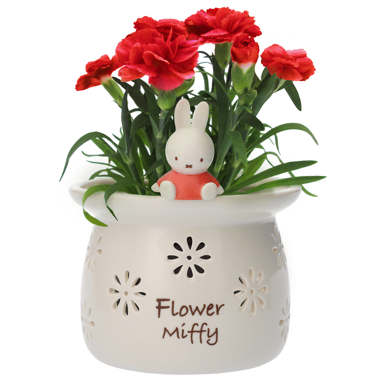 ミッフィーがおすわりしたシンプルな陶器ポットに、カーネーションをセットしてお届けいたします。生花を楽しんだ後は、付属のLEDキャンドルライトを点けて、インテリア照明としてお楽しみいただけます。