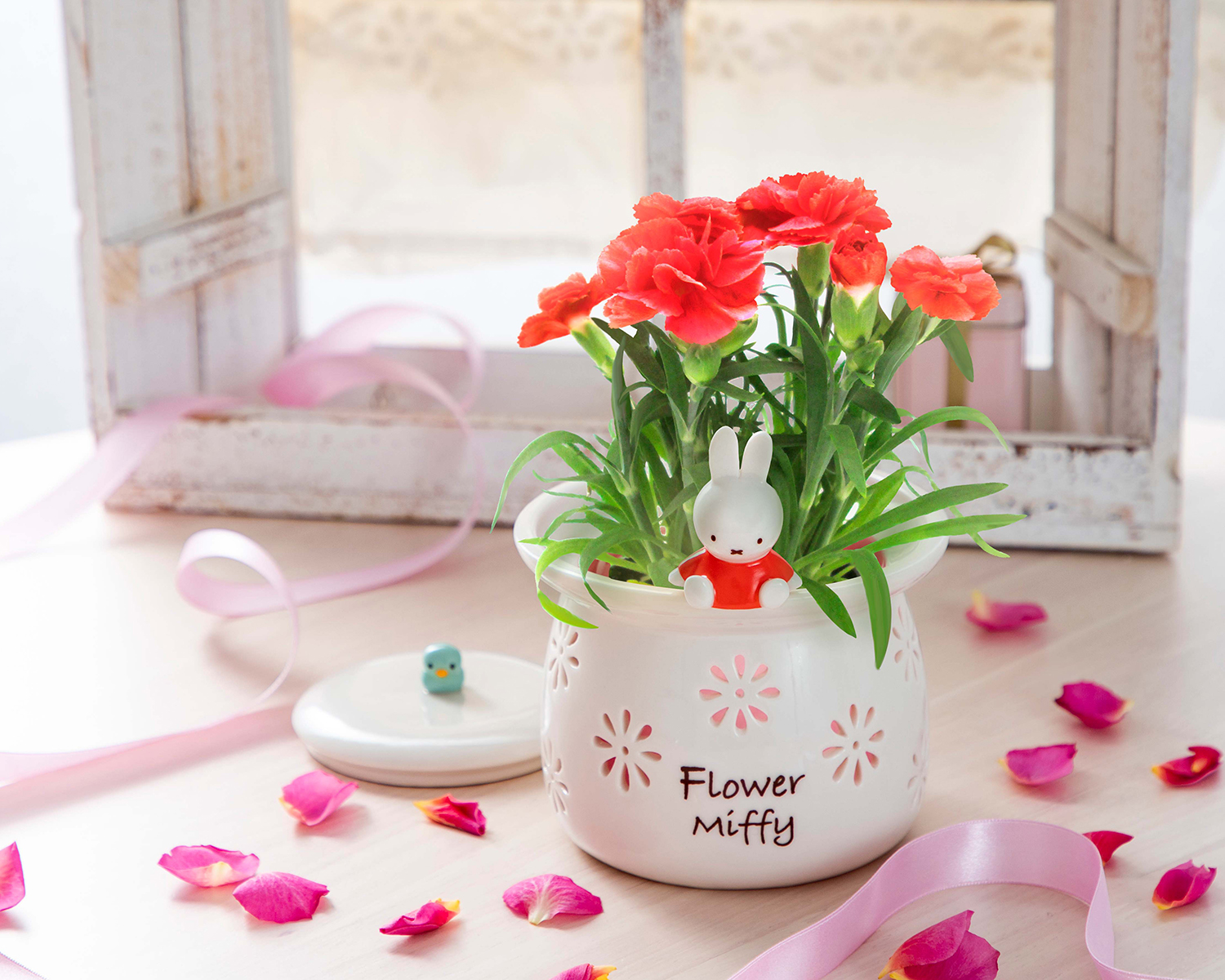 毎年人気の“フラワーミッフィー”の母の日配送ギフトを、今年は3種類のラインナップからお選びいただけます。ちょこんとおすわりするミッフィーがかわいらしい陶器のポットに、カーネーションをセットした“キャンドルライトホルダーポット カーネーションセット”は、お花を楽しんだ後、陶器のポットに付属のLEDキャンドルライトをセットすることでインテリア照明としてお楽しみいただけます。