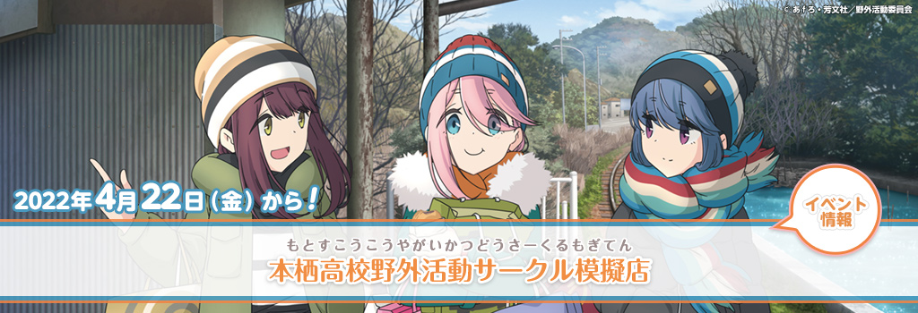 ホビーストックは、2022年4月22日より、期間限定ショップ“ゆるキャン△ 本栖高校野外活動サークル模擬店”を開催することをお知らせいたします。ホビーストックの『ゆるキャン△』描き下ろしグッズの先行販売の他、イベント限定の購入特典をご用意しております。