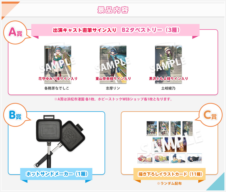 各店でのイベント期間中、ホビーストックが発売元の『ゆるキャン△』対象商品を2,000円(税込)お買上げごとに1回、豪華賞品が当たる抽選会にご参加いただけます!