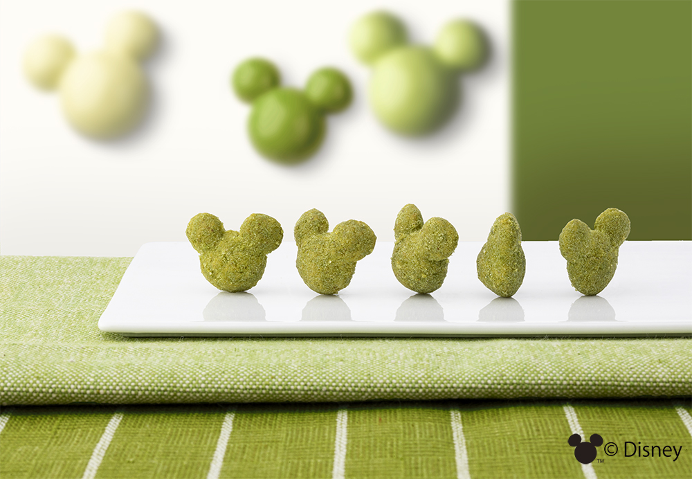ぷっくり3Dがキュートなミッキーアイコンの生地に、ホワイトチョコレートをとろりがけ。抹茶ミルクパウダーでくるんで、まろやかな“抹茶ラテ味”に仕上げました。
