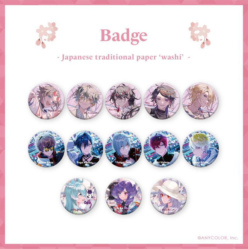 種類:全15種(遊間ユーゴ、サニー・ブリスコー、ファルガー・オーヴィド、アルバーン・ノックス、浮奇・ヴィオレタ、闇ノシュウ、アイク・イーヴランド、ルカ・カネシロ、ミスタ・リアス、ヴォックス・アクマ、エリーラ ペンドラ、セレン 龍月、狐坂 ニナ)