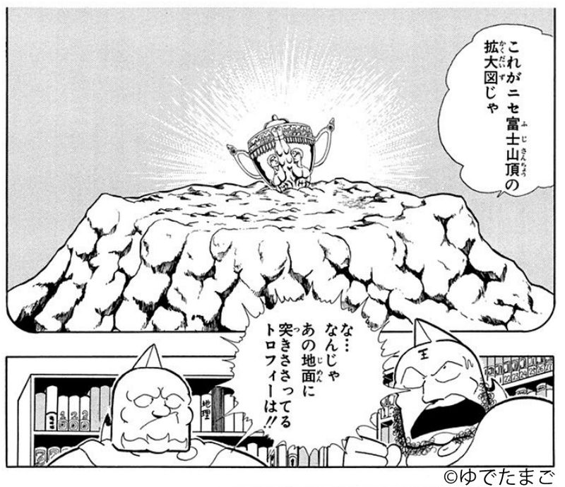 富士山の隣にそびえ立つ、ニセ富士“トーナメント・マウンテン”の頂上に突き刺さっているトロフィー。長い間、何人もの力じまんの人間たちがトロフィーを地面から抜きとろうとしてもことごとく失敗に終わる。