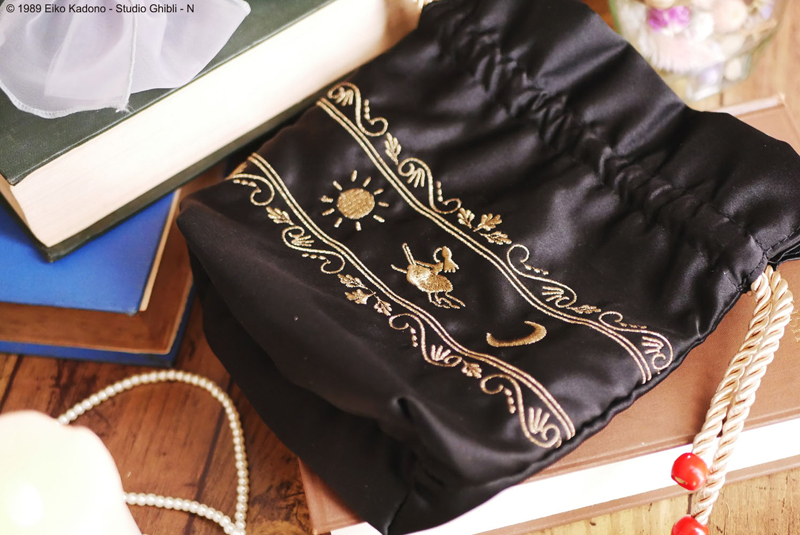 また、黒のサテン生地を使用し、コキリの看板に描かれている太陽と月、魔女を金の刺しゅうで表現した巾着は、ひも部分を金のロープ仕様とし、先端にはコキリの耳飾りをイメージした赤いビーズをあしらっています。内生地にはジジとフラスコや薬草が描かれた総柄デザインを使用し、大人の雰囲気を漂わせながらも細かなディテールにこだわっています。