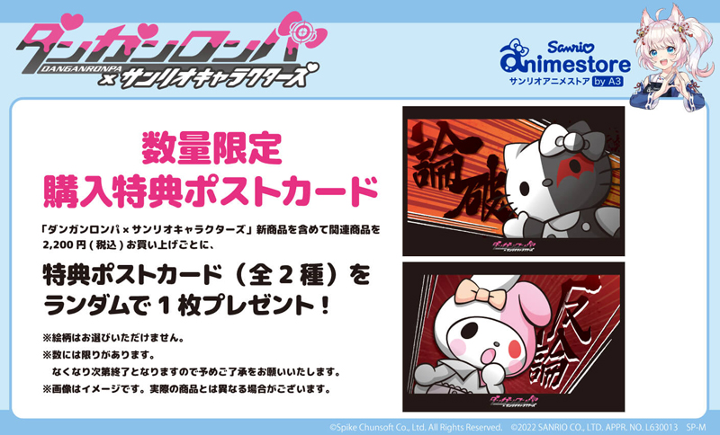 “ダンガンロンパ×サンリオキャラクターズ”の新商品を含め、関連商品を税込み2,200円お買い上げごとに特典のポストカードをプレゼント!