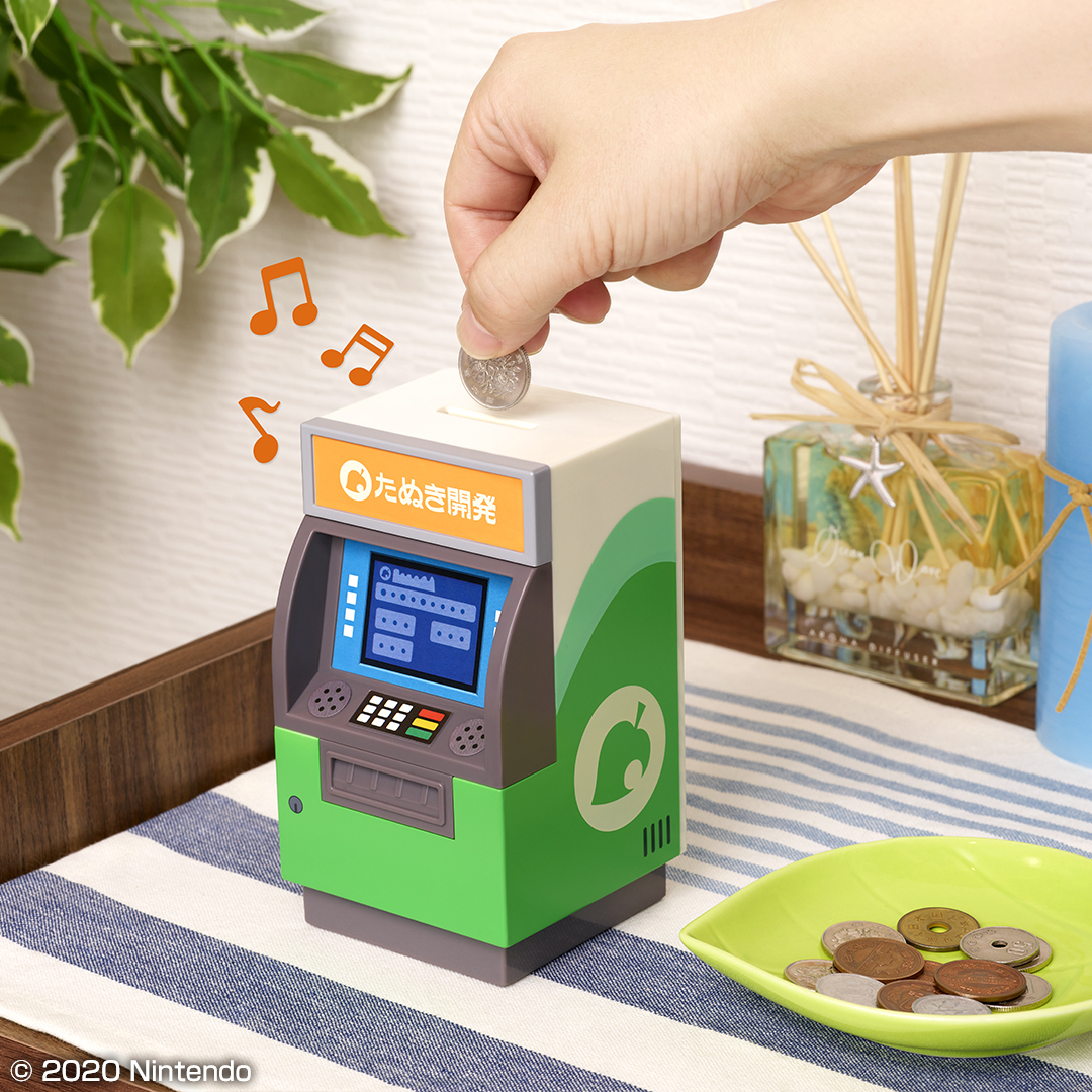 コインを入れると音が鳴る、タヌポートATM型の貯金箱。コインを入れるたびにATMの入金音が楽しめ、貯め続けるとローン返済音が鳴ることも♪