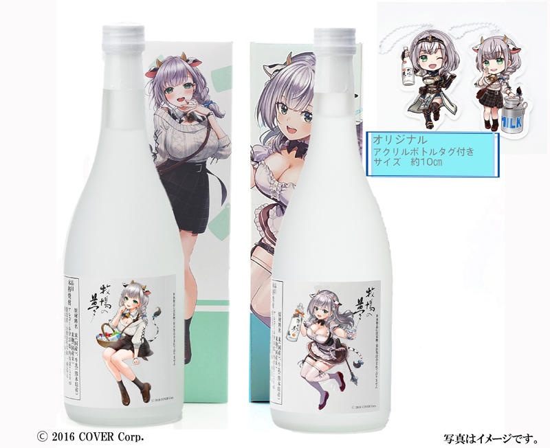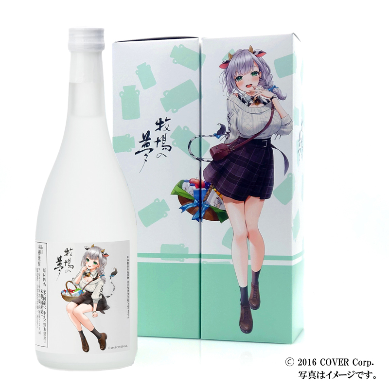 商品は描き下ろしオリジナルパッケージを使用した、大和一酒造元製造の吟醸酒感覚ですっきり飲める“牧場の夢16度”、甘くフルーティな香りの“牧場の夢25度”、“16度”、“25度”の2本にイラストレーターの粗茶さん描き下ろしの“白銀ノエル”があしらわれたアクリルボトルタグが2種類付いたセット品の全3種類です。