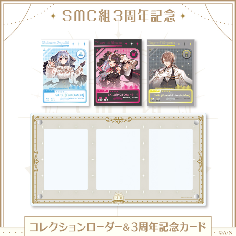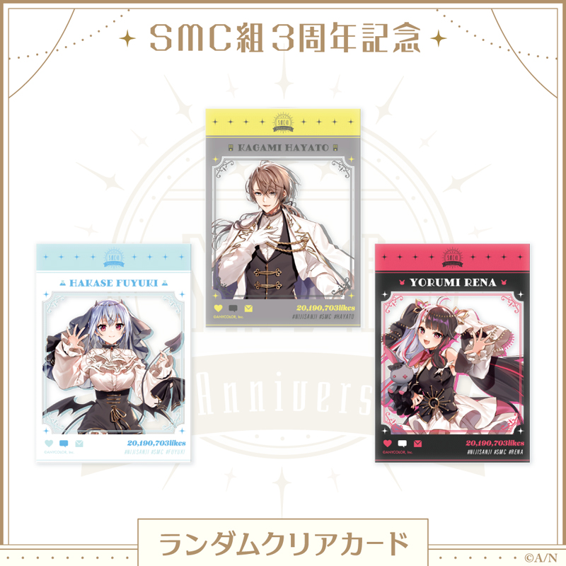 2019年7月3日にデビューした葉加瀬冬雪、夜見れな、加賀美ハヤトの3名が集ったユニット“SMC組(読み:すめしぐみ)”の3周年を記念して、にじさんじオフィシャルストアにて“SMC組3周年記念グッズ”の販売が決定いたしました。