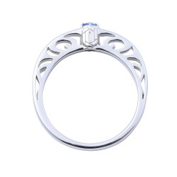 TVアニメ『鬼滅の刃』に登場する宇髄天元のリングです。甲丸フォルムに大粒のイメージカラーストーンをセットし、内側には名前刻印を施しました。石座部分には日輪刀の鍔をさりげなく取り込んだクラシカルなデザインです。