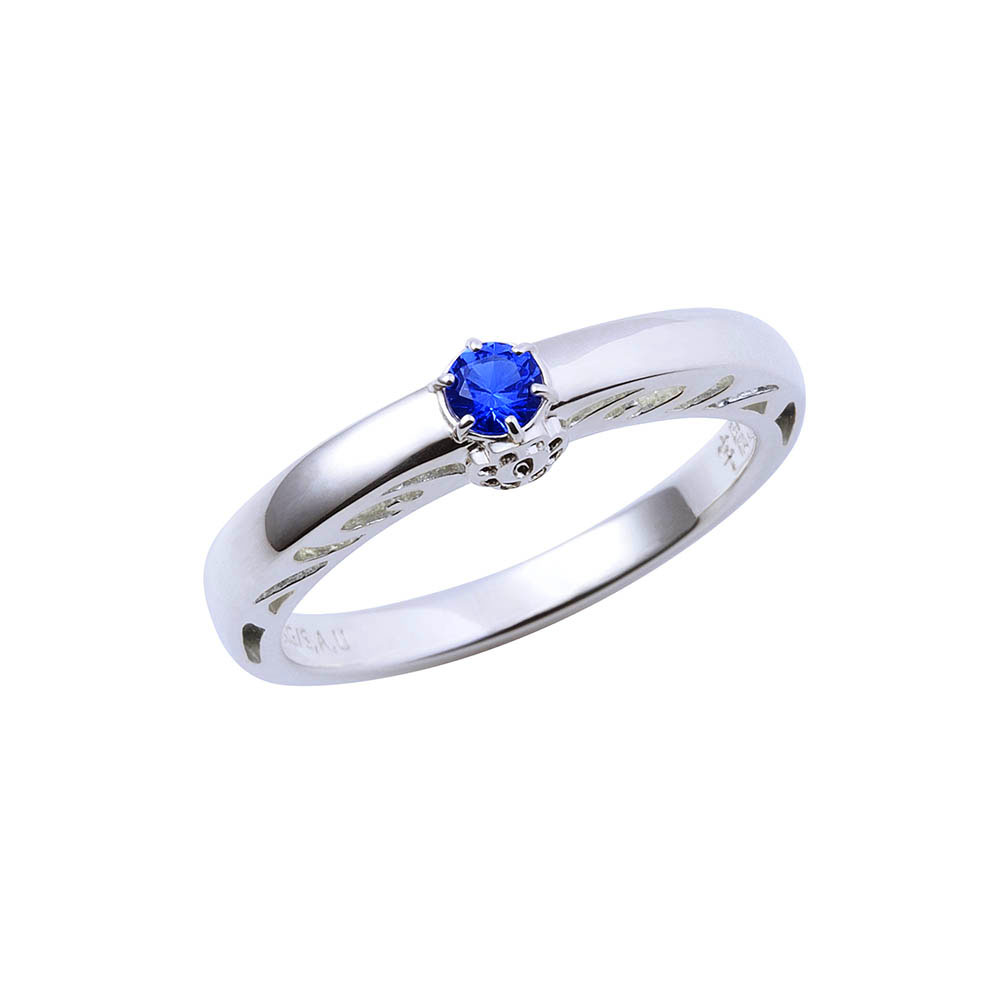 TVアニメ『鬼滅の刃』に登場する冨岡義勇のリングです。甲丸フォルムに大粒のイメージカラーストーンをセットし、内側には名前刻印を施しました。石座部分には日輪刀の鍔をさりげなく取り込んだクラシカルなデザインです。
