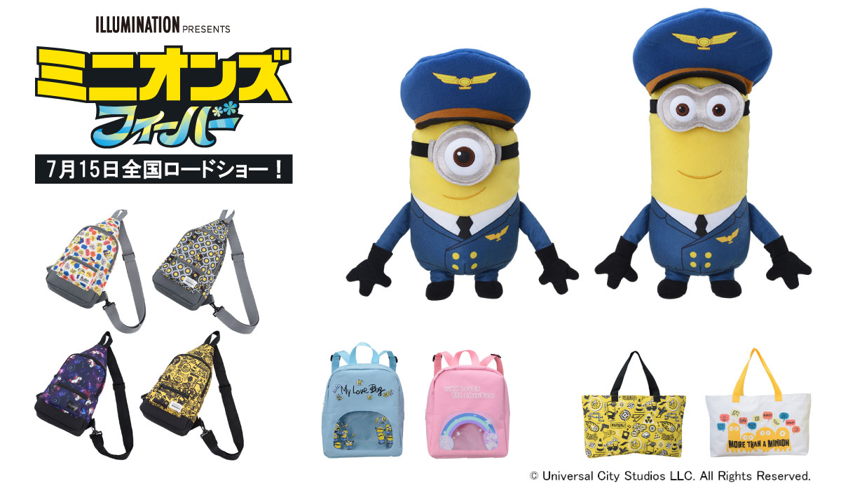 劇中に登場するパイロット姿の“ケビン”、“スチュアート”の“ミニオンズ フィーバー スペシャルパイロットぬいぐるみ”や、“ミニオンズ”がデザインされたリュック・バッグ8種と、子どもから大人まで楽しめるラインナップとなっています。