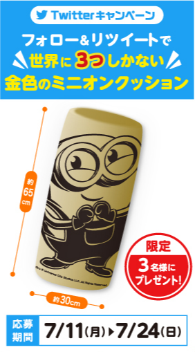 モーリーファンタジー公式Twitterをフォローし、指定ツイートをリツイートしていただいた方の中から抽選で3名に世界に3つしかない『金色のミニオンクッション』が当たります。