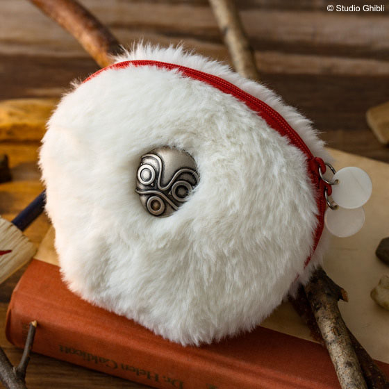 同様に、サンが身に着けている毛皮をイメージした『サンのファーポーチ』には、サンのお面やピアスをモチーフにしたファスナー引手などが付いています。内生地はサンのスカートを彷彿とさせる青色です。凛々しさとかわいらしさを表現した細かなディテールにご注目ください。