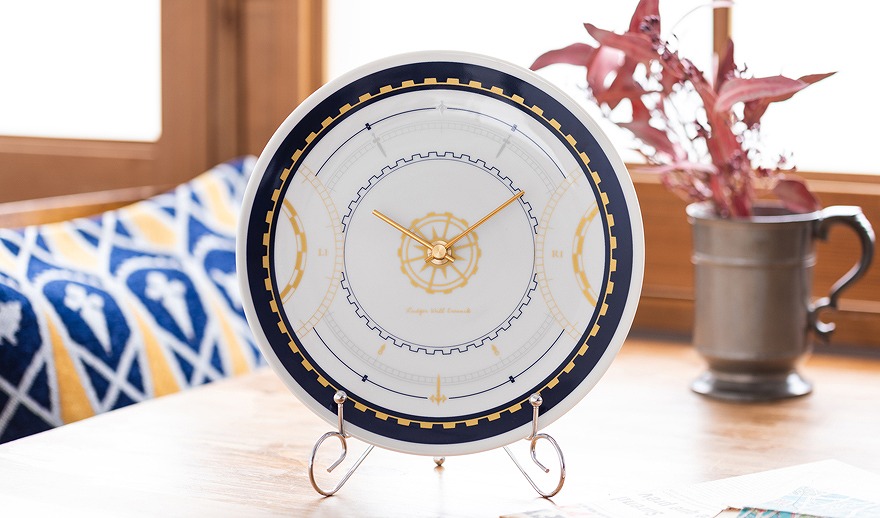 ルドガーが持っている懐中時計をイメージした陶磁器製のクロックです。盤面の左右には、ゲーム内の選択肢画面をイメージしたプリントが。