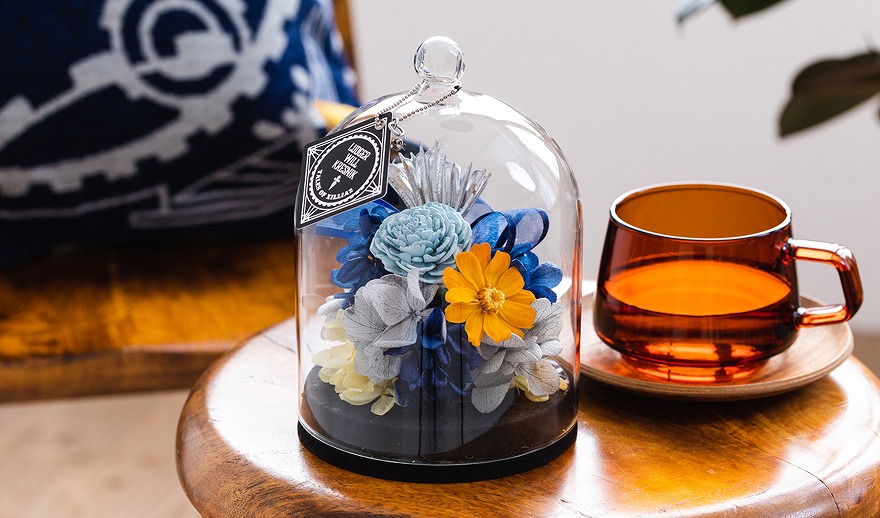作中に登場するバラをイメージしたブルーローズをメイン。正義感あふれるアルフェンらしい、スタイリッシュな雰囲気のアレンジメントです。飾って楽しむのはもちろん、写真の撮影背景・小物としても。置く場所を選ばないサイズ感。