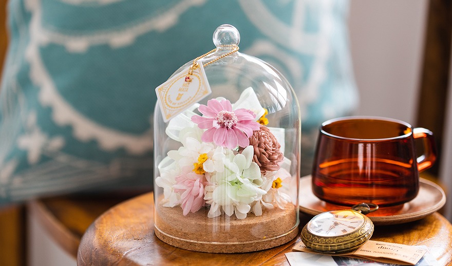 エルの服装をイメージしたピンクのジニアと、淡いグリーンのアジサイが可愛らしいインテリアフラワーです。飾って楽しむのはもちろん、写真の撮影背景・小物としても。置く場所を選ばないサイズ感。