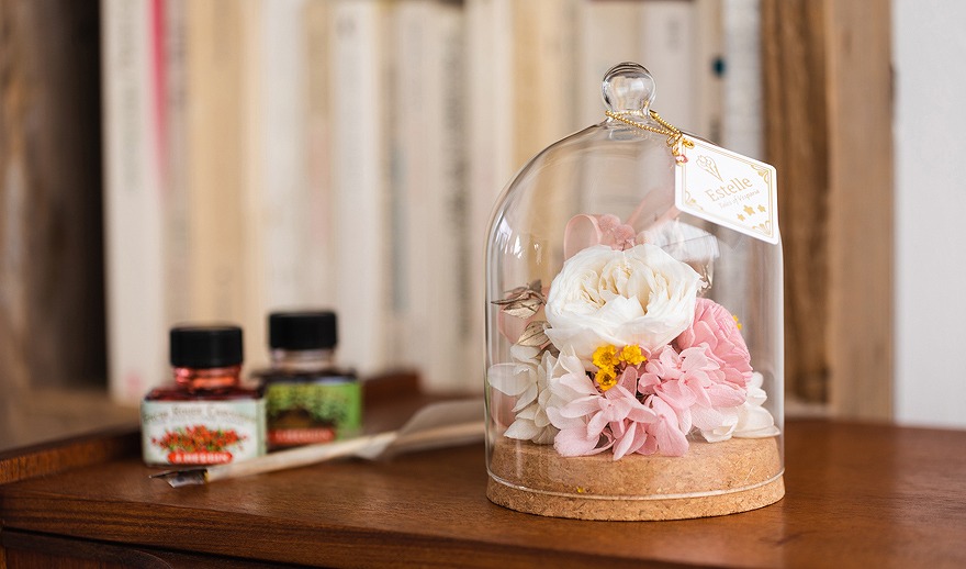 可憐でボリューム感のあるバラを配置し、衣裳をイメージした優しい白と淡いピンクのカラーでまとめた、エステルらしい品のあるインテリアフラワーです。飾って楽しむのはもちろん、写真の撮影背景・小物としても。置く場所を選ばないサイズ感。