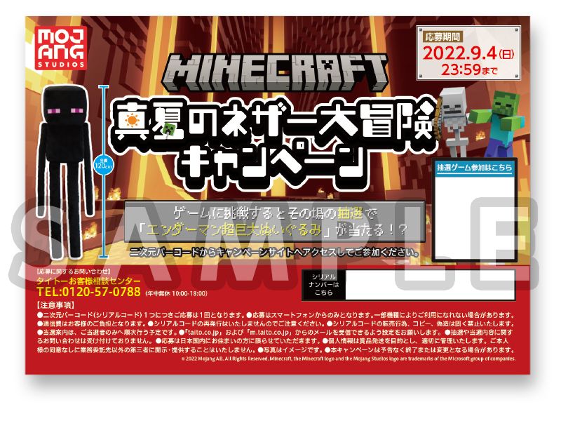 2022年7月16日~8月28日の期間中、タイトーのお店では“対象台”というPOPのついたゲーム機に500円分の硬貨投入または電子マネーご使用、タイクレをご利用の場合は対象台バナーのついた景品を有償TC15,000以上連続でのご使用で“マインクラフトオリジナルうちわ(全6種)”1枚と“Wチャンス応募券”をプレゼントいたします。応募者の中から抽選で15名に“マインクラフト エンダーマン超巨大ぬいぐるみ”をプレゼントいたします。
