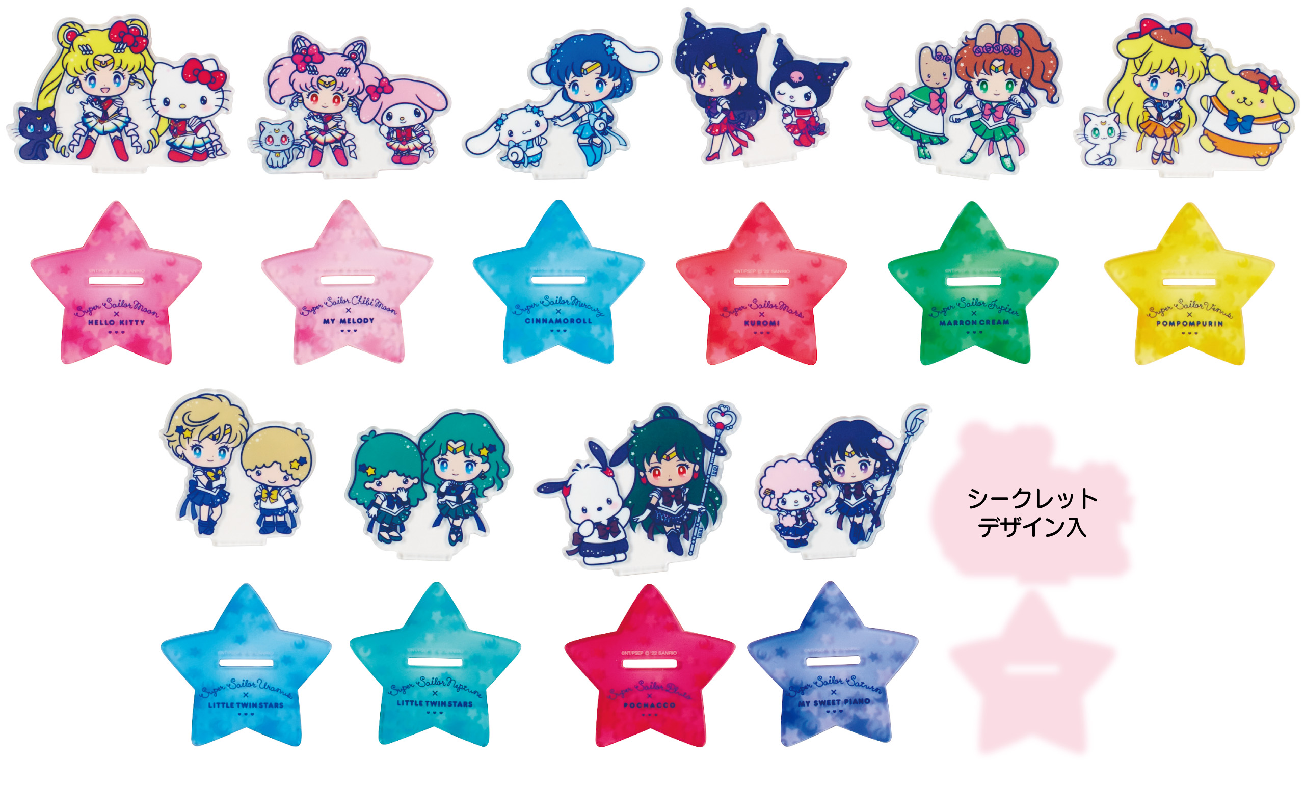 さらに、シークレットアクリルスタンドには、外部太陽系の4戦士とサンリオキャラクターズ(スーパーセーラーウラヌスとリトルツインスターズ(キキ)、スーパーセーラーネプチューン×リトルツインスターズ(ララ)、スーパーセーラープルート×ポチャッコ、スーパーセーラーサターン×マイスウィートピアノ)のコラボデザインのほか、シークレットデザインもご用意しています。