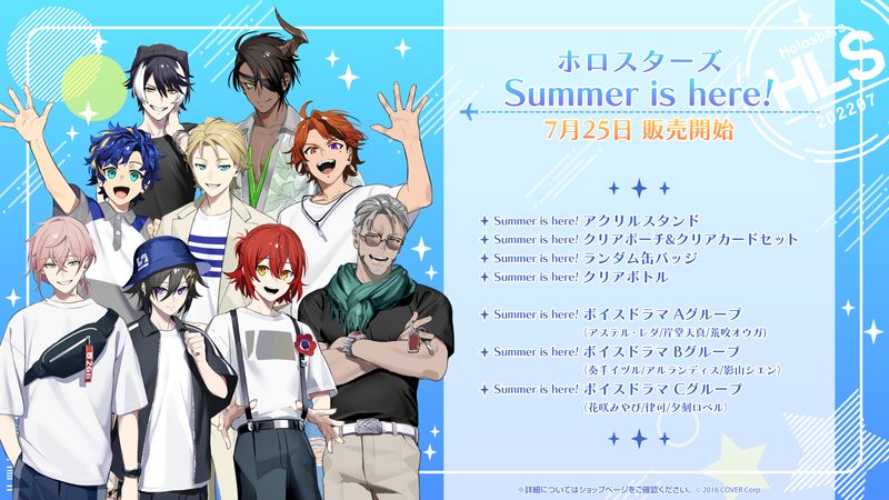 カバーは、“ホロライブプロダクション”傘下の男性VTuberグループ“ホロスターズ”において、2022年7月25日19:00より公式ECサイト“hololive production OFFICIAL SHOP”にて“Summer is here!”のオリジナルグッズを販売します。