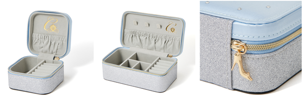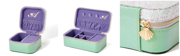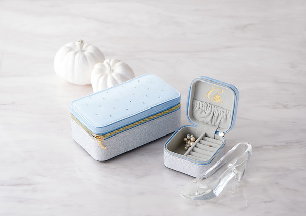 シンデレラをイメージした持ち運びができるジュエリーボックス。 ガラスの靴をモチーフにした取っ手がポイント。 内側にはストーリーに登場するかぼちゃの馬車と、 シンデレラのイニシャル「C」を組み合わせたデザインが箔押しで入っています。