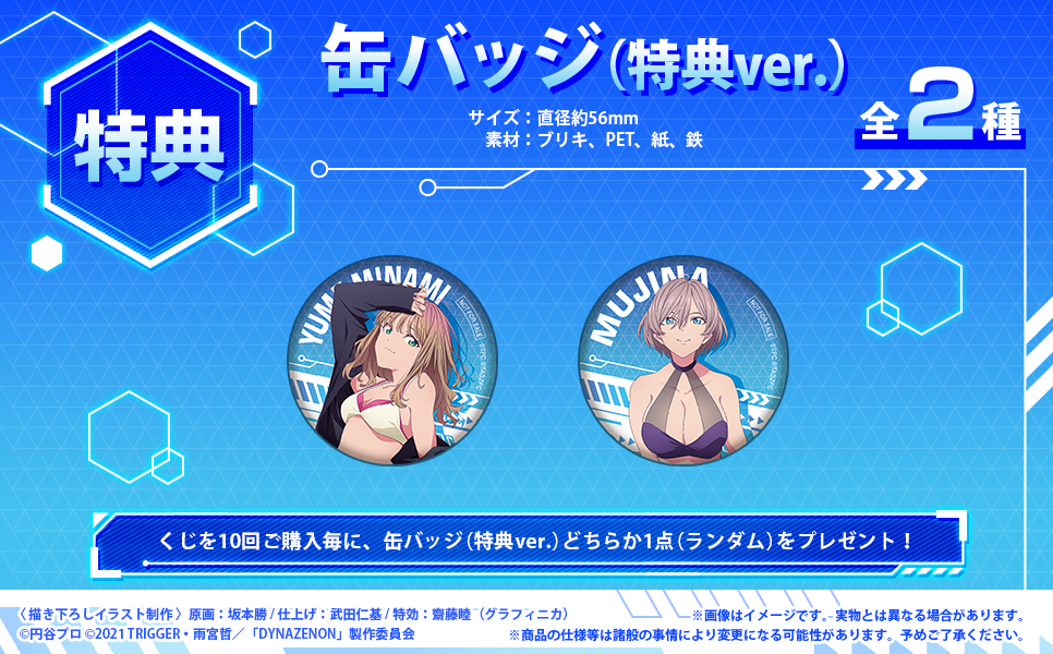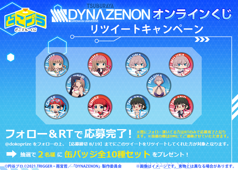 “どこプラ”公式Twitterアカウントでは、“『SSSS.DYNAZENON』 オンラインくじ”発売を記念して、抽選で2名様に缶バッジ全10種セットが当たる、プレゼントキャンペーンを実施中です。