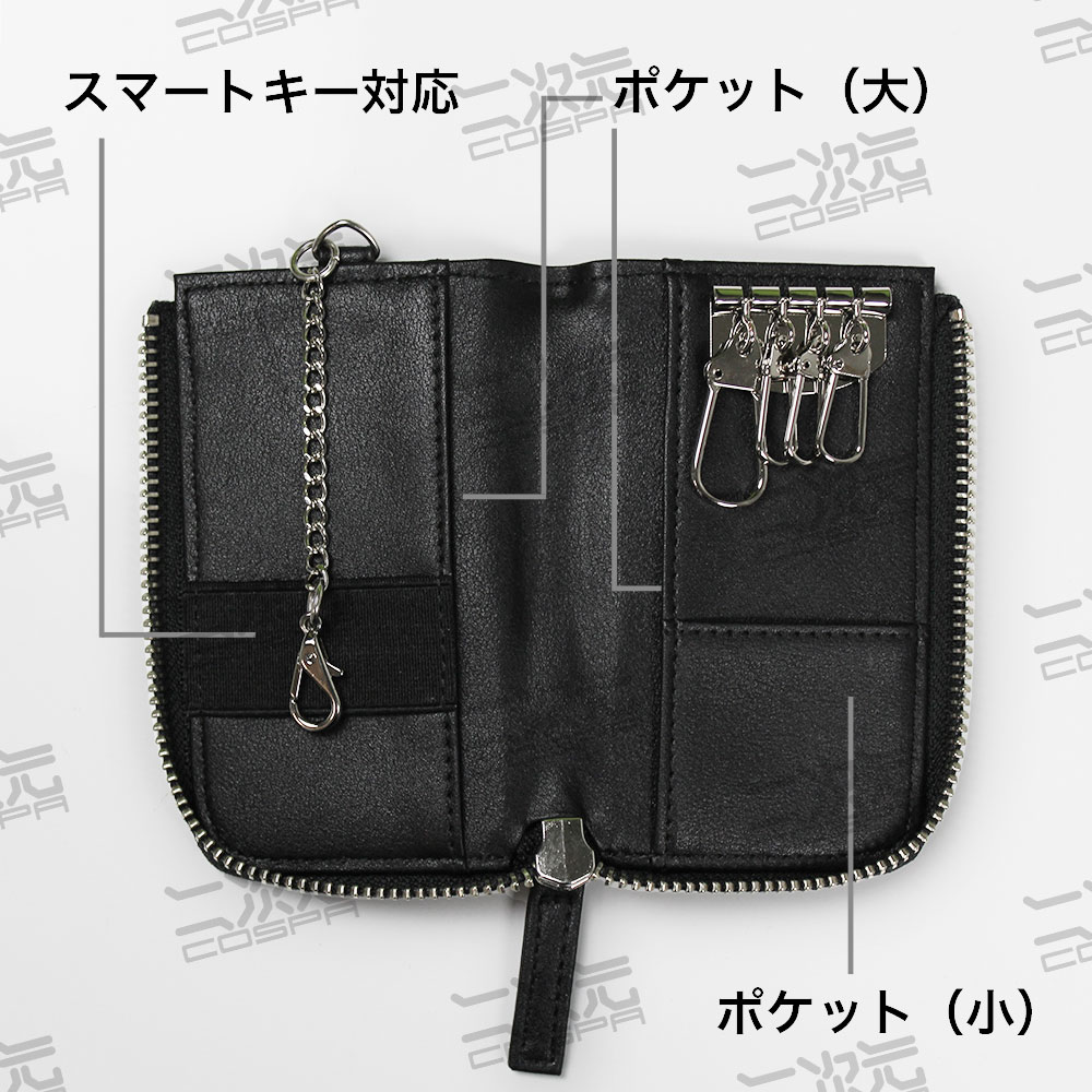 カードポケットを2つ装備しており、交通系ICカードや電子マネー用カードも収納でき、これ一つでお出かけできます。フルオープンで取り出しやすく、上部が開いているので鍵はキーケースにつけたまま使用可能です。合皮素材にエンボス加工で表現されており、高級感のある仕上がりとなっています。