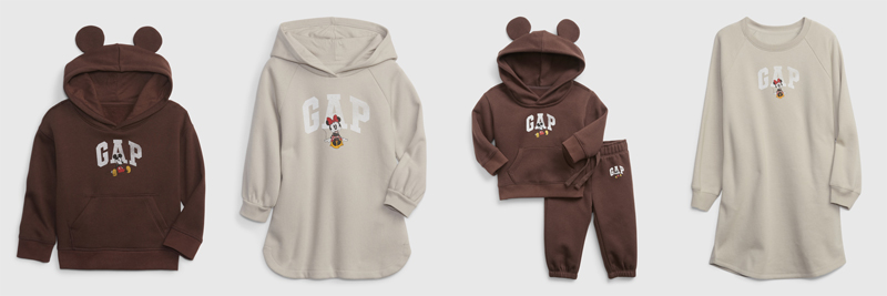 メンズは、GAPロゴにミッキーマウスが重なり合うコラボデザインで、秋らしいブラウンカラーのフーディーを展開。キッズは、ボーイズからメンズと同じデザインのフーディー、ガールズからはミニーマウスとGAPロゴデザインのフーディーやスウェットドレス、Tシャツが並びます。
