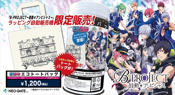 期間限定の設置となるこちらの自動販売機には大型モニターが埋め込まれており、『Bプロ』関連CMが続々上映されるということなのでどうぞお楽しみに♪ 自販機限定商品の「『B-PROJECT~鼓動*アンビシャス~』エコトートバッグ」もぜひゲットしたい!