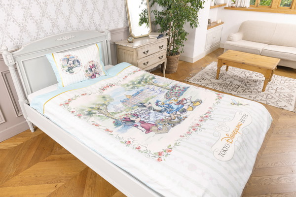 ご自宅でも、ホテルで過ごした夢のような気分に包まれるひとときをお過ごしいただけます。このグッズは、シングルサイズの掛けふとんカバー、まくらカバー、ブランケットがそれぞれ一つずつセットになっています。掛けふとんカバーには、東京ディズニーランドホテルとシンデレラ城を背景に、ミッキーマウスと仲間たちがガーデンでティータイムを楽しむ様子が描かれています。