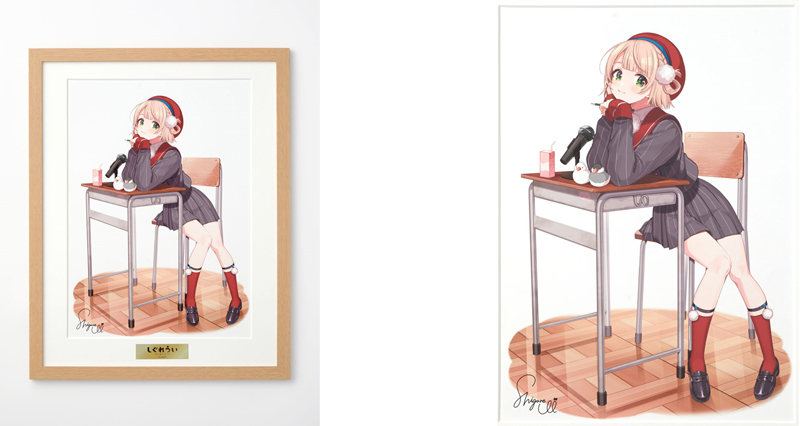 プリモアートとは鮮やかで繊細な発色が特徴の高精細印刷技術で、原画に限りなく近い色調やタッチを忠実に再現したものです。額装はイラストのイメージに合わせた木目調のものを採用し、イラストの世界観を引き立てます。